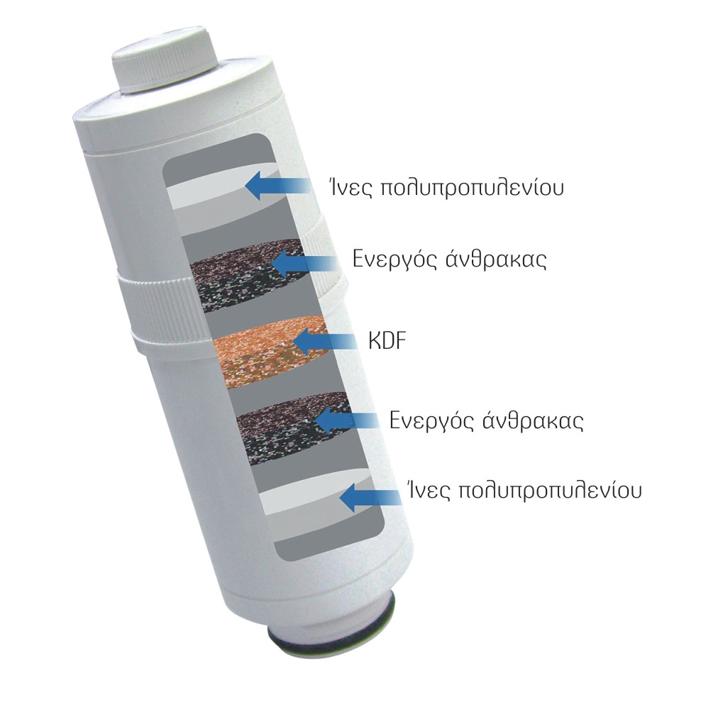 1 στρώμα KDF (Kinetic Degradation Fluxion = υψηλής καθαρότητας κόκκοι από χαλκό και ψευδάργυρο για την μείωση των μολισματικών στοιχείων από το νερό μεσω οξειδαναγωγικής αντίδρασης).