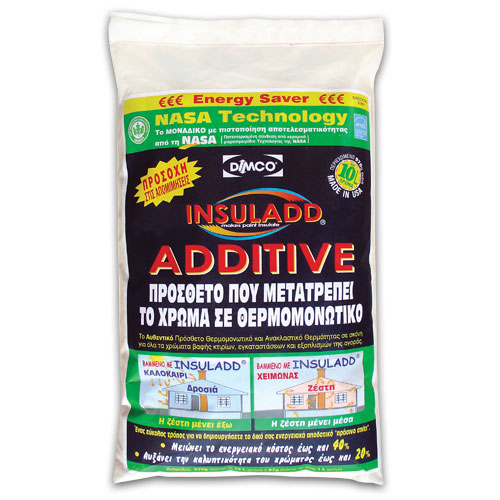 Το INSULADD® Additive είναι ειδική σκόνη “κεραμικών μικροσφαιριδίων” που το αναμειγνύετε εύκολα με οποιοδήποτε χρώμα της αγοράς και το μετατρέπει σε θερμομονωτικό χρώμα. Βάφετε και θερμομονώνετε το σπίτι σας ταυτόχρονα! Βάφετε μέσα-έξω το σπίτι σας και το μετατρέπετε σε ένα ενεργειακά αποτελεσματικό, οικολογικό & “πράσινο” κτίριο. Έτσι εξοικονομείτε πολύτιμη ενέργεια από τη θέρμανση (το χειμώνα) και από την ψύξη (το καλοκαίρι).