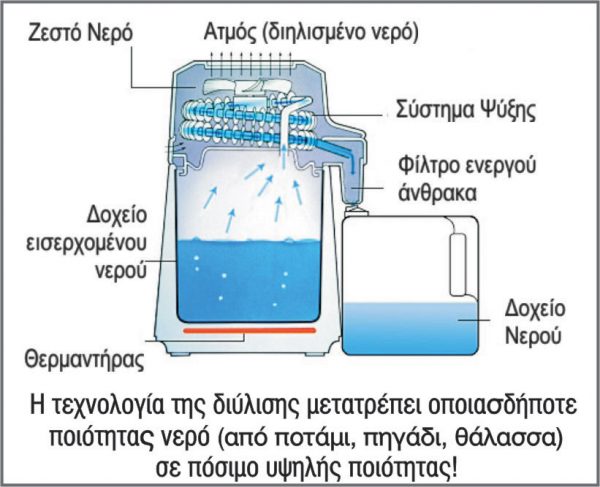 Η μέθοδος της διύλισης αφαιρεί αποτελεσματικά όλα τα μολυσματικά στοιχεία από το νερό, όπως χημικές τοξίνες, ραδιενεργά στοιχεία, ανόργανα μέταλλα, βιολογικοί οργανισμοί κ.ά.